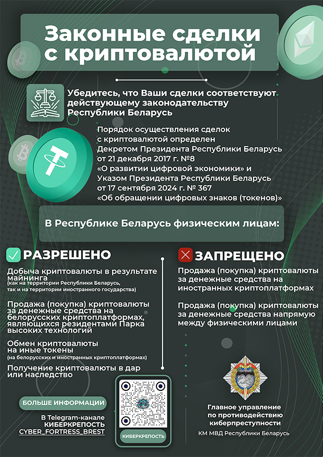 Операции по покупке и продаже криптовалюты за денежные средства (белорусские рубли, иностранная валюта или электронные деньги) разрешены только через криптобиржи (операторов обмена криптовалют), являющихся резидентами Парка высоких технологий. Запрещены и являются незаконными операции по купле-продаже криптовалюты на иностранных криптобиржах и у физических лиц. Порядок осуществления сделок с криптовалютой регулируется Указом Президента Республики Беларусь от 20.09.2024 № 367, за нарушение которого предусмотрена ответственность по ч. 3 ст. 13.3 КоАП, предусматривающей штраф с конфискацией всей суммы дохода.